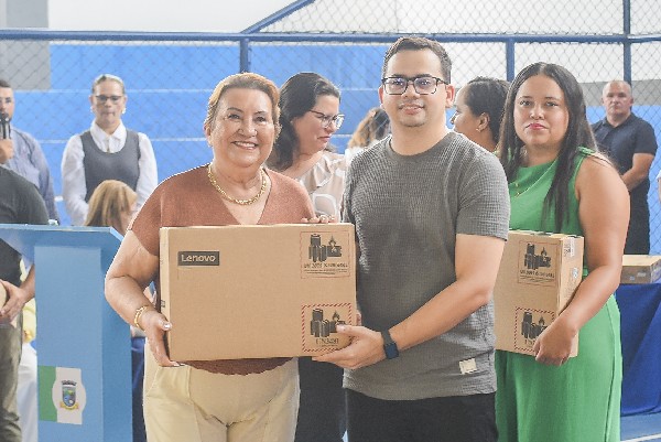 Prefeitura reinaugura a quadra poliesportiva da Escola Sales Filhos e entrega 456 notebooks aos professores